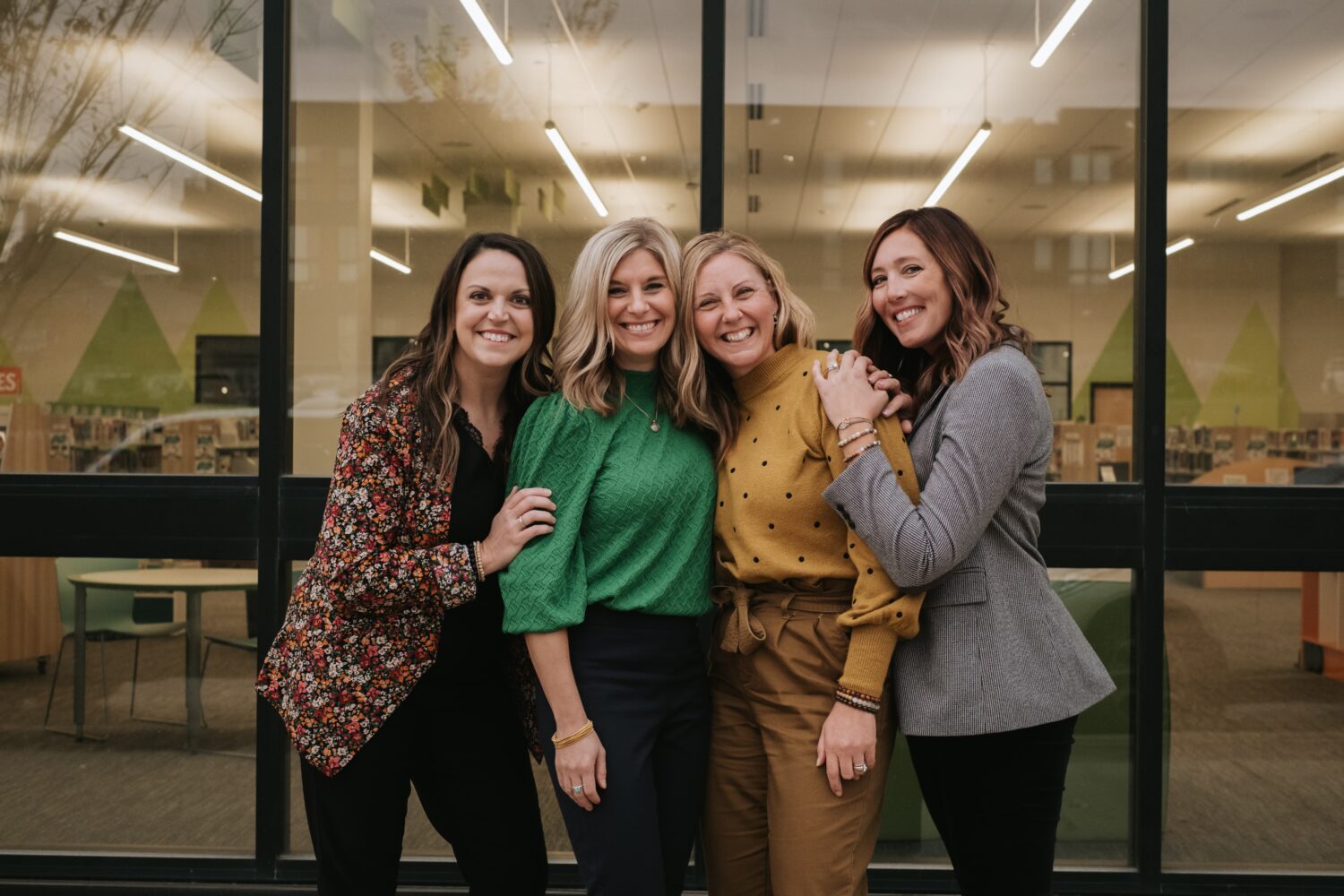 Four women laughing outside a library